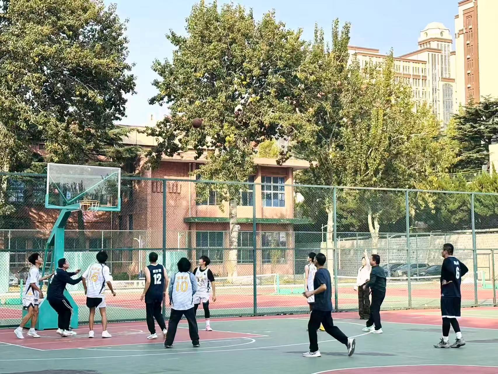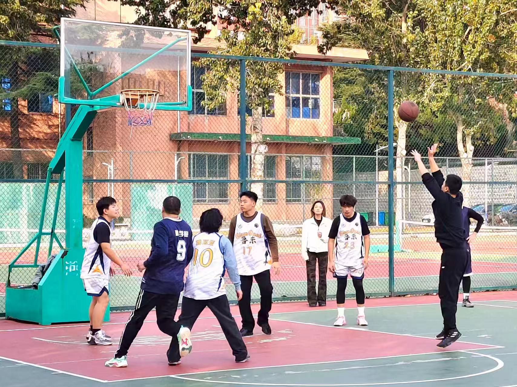 比赛中,老师们褪去平日的严肃,化身赛场“健将”,传球、运球、投篮一气呵成,动作娴熟且富有力量,展现出良好的运动素养;学生们则充分发挥年轻队员的速度与爆发力,积极跑位、默契配合,攻防转换间尽显青春锐气。赛场上,没有身份的隔阂,只有并肩作战的队友与全力以赴的对手。当教师队精准投篮得分时,学生们自发响起热烈掌声;当学生队巧妙突破防线时,领导老师们也不禁为年轻人的灵动点赞。中场休息时,师生们围坐在一起,交流打球技巧,畅谈学习生活,欢声笑语中拉近了心与心的距离。